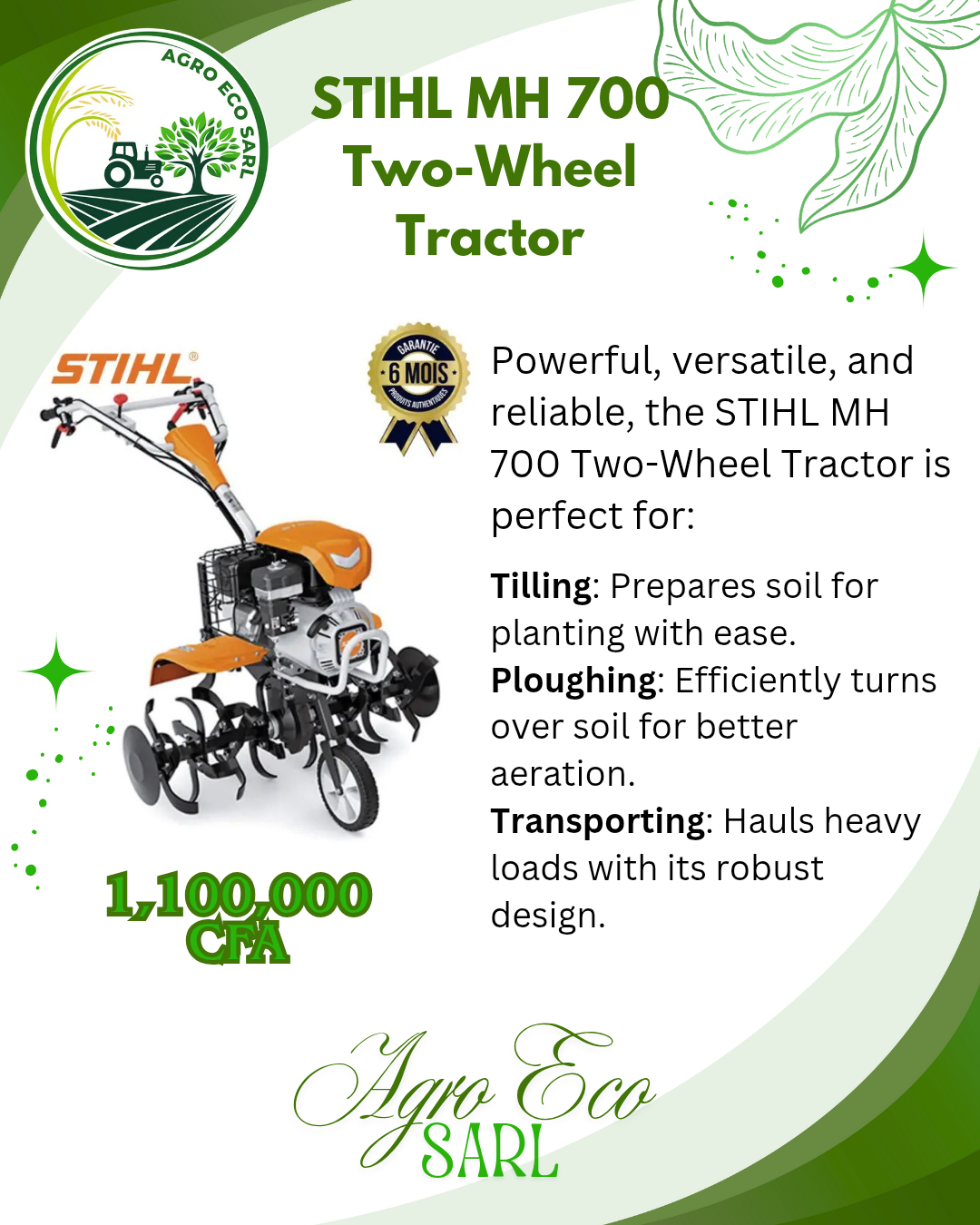 Agro Eco Sarl is a Cameroonian company specializing in the distribution of agricultural products such as phytosanitary products, seeds, fertilizers, machinery, solar systems, and irrigation equipment. Its mission is to empower farmers and promote food security with sustainable agricultural solutions.